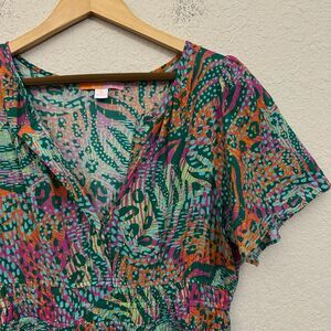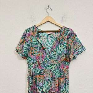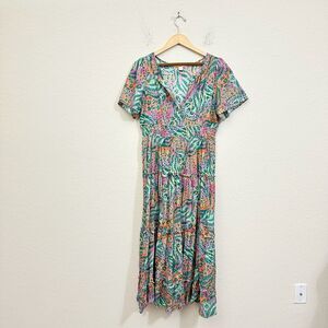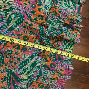 This is a BRITON COURT maxi dress in size L, featuring a floral pattern with metallic accents. The dress has a V-neck, puff sleeves, and is adorned with ruffles and layers. It is made of cotton, perfect for summer, fall, and spring. The multicolor design adds a bohemian touch, ideal for travel, parties, or casual occasions. The dress is collarless, lightweight, and has a hook & eye closure. Made in India.