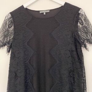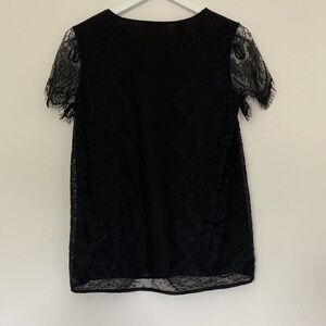 This top has a black lining with a beautiful black lace-style overlay. The sleeves are also a lace-style with fringes at the end. The top is subtle from afar but packs a punch up close. EUC.