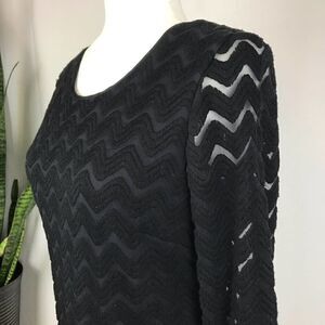 This dress is so classy and cool. The black chevron zig zag pattern is soft dispersed among mesh zig zag layers. Black lining.