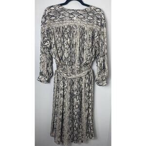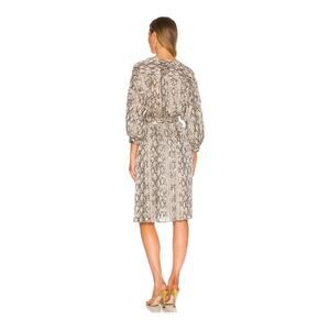 Excellent like new condition, never worn. Color: Metallic Python. Pull on pullover style with smocked elasticized waistband. Optional waist tie. Lined. Buttoned cuffs. Gold metallic shimmer thread detail throughout. V-neck. Lurex striped animal print. Drop shoulder. Long sleeve. Sold at Revolve. MSRP $428