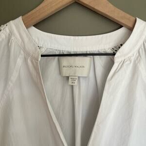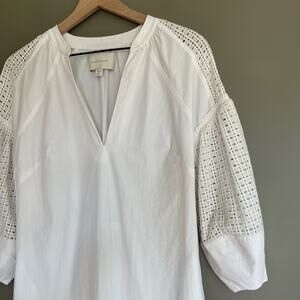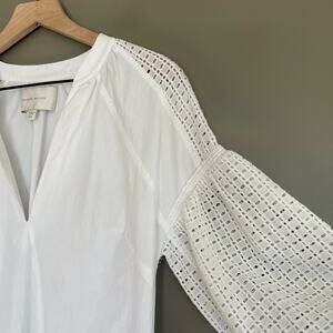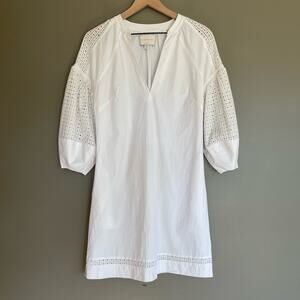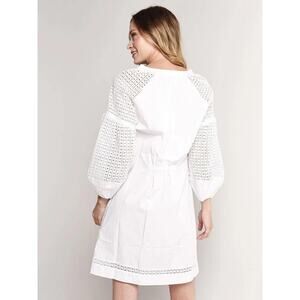 BROCHU WALKER Koren Dress in White, Size XS, A-Line Silhouette, Mini Length, 3/4 Length Sleeves, Blouson Sleeves, Eyelet Lace Sleeves, Notched V-Neck, Pullover, Relaxed Fit, Excellent Condition with No Flaws.