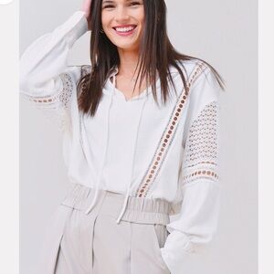 FEATURES: Blouse Point Collar Collared, Self-Tie Neckline Long Sleeve Banded Cuffs Smocked Button-Cuff Detail Custom Eyelet And Circular Lace Trim Insets Popover Silhouette Relaxed Fit Straight Hem 100% Creped Polyester