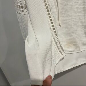 Long sleeve blouse with decorative custom eyelet and circular lace trim inserts.