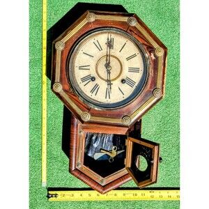 Octagon wood clock face housing with drop down schoolhouse hanging pendulum concealed by a gold stencil and black decorated access window.