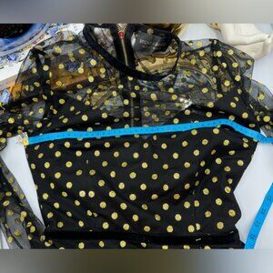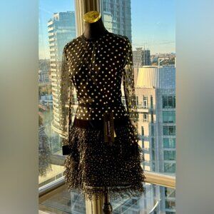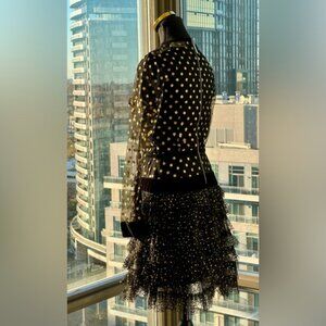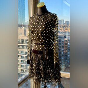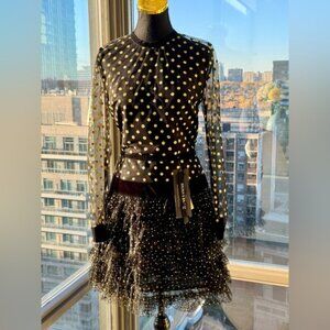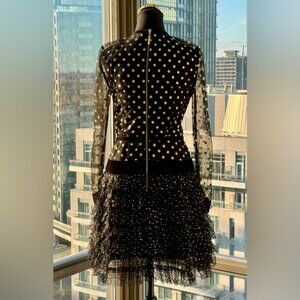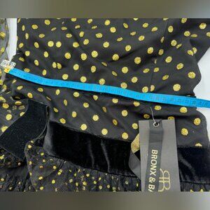 T'is the season for this adorable Bronx & Banco Suns Mini Dress. Crafted from black mesh with a sparkly gold glitter dot overlay, this dress features long sleeves, and is fitted at the bust and waist, before flaring out with an adorable black mesh tulle fringe that bears the glitter dots to match. With velvet trim details, this dress is lined from the bust.