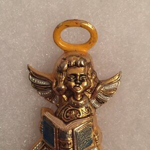 BROOCH PIN VINTAGE DAMASCENE GOLD WHITE ANGEL SPAIN CHRISTMAS HOLIDAY JEWELRY