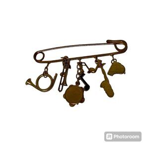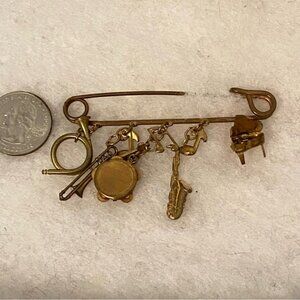 VINTAGE BROOCH SAFETY PIN BRASS MUSIC THEME MUSICAL INSTRUMENTS NOTES 5 DANGLE