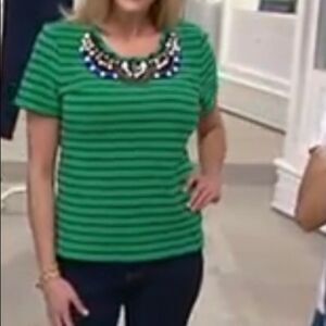 Features: short sleeves, yarn-dyed stripes, embellished scoop neckline