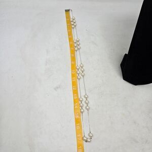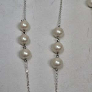 This elegant necklace features lustrous faux pearls beautifully paired with a silver tone chain. Perfect for adding a touch of sophistication to any outfit. It measures approximately 35" long. It can be worn as a single strand long necklace or double overed for a layered look. The faux pearls are in groups of three with longer chains between. Please see all photos for details as this is the exact pair you will receive. Thank you so much for looking. I am always open to reasonable offers. Have a beautiful day!