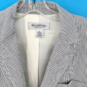 Classic, lightweight seersucker blazer jacket from Brooks Brothers! Features classic blue & white stripes, perfect for layered office looks or casual wear. Comfortable fit with a timeless aesthetic. 3/4 sleeves can be worn rolled up or down.