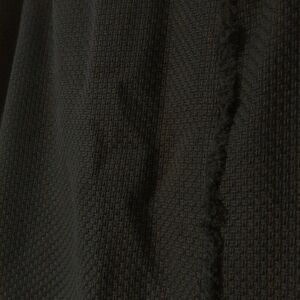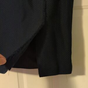 Navy blue in color with textured feel and front side slit. Skirt is lined. Above slit is a frayed look.