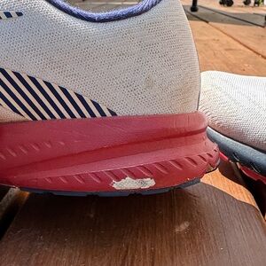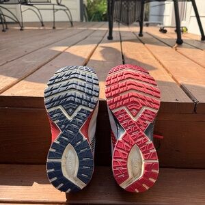 Stylish athletic shoes with a white upper and red accents. Perfect for running or casual wear. Brooks Launch 7 Size 8.5!!! Good condition however there is some paint chips on sole of shoe.