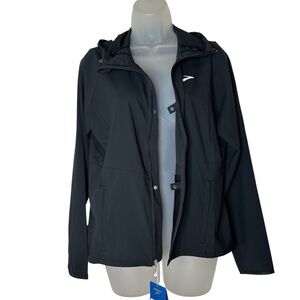 BROOKS Women Sz M Black Canopy Lightweight Hood Pockets Packable Running Jacket.