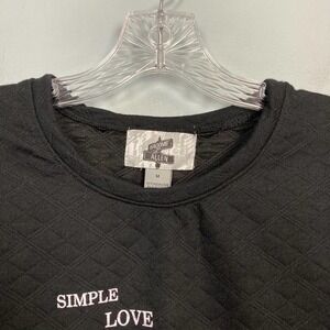 Broome Allen Black Quilted Simple Love Graphic Sweatshirt Juniors' Size M. Black quilted sweatshirt of99% polyester, 1% elastane, not much stretch. "Simple Love makes life fancy, Fancy life makes love simple." quote on the front. Graphic is white and black sparkle. In flawed, new without tags condition. There is a bit of puckering at the neckline, see photos. There is a little bit of bleed through of the black coloring through the lettering of the word "fancy", also see photos. Measurements taken flat: pit to pit: 18", sleeve length: 24", shoulder to hem length: 25.5".