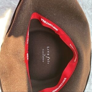 Brown Hat with multi color head band. The brim is bent out of shape other then that the hat is in good pre loved condition,