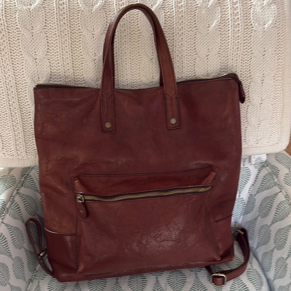 Stylish brown leather tote bag with front zipper pocket, sturdy handles and adjustable shoulder straps to convert to bag pack. Two different attachments for the straps to choose from. Zipper pocket in the back. Large zipper pocket inside with leather trim. Lining is cotton; 2 small pockets; zipper pocket in the lining as wide as the bag. About 16”w and 20”long including the handles. Bottom 4” wide. Extremely spacious and pockets for everything! Beautiful Italian leather, handmade in Florence. Top quality. In excellent condition, smoke and pet free home