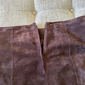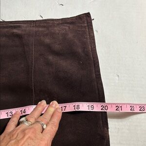 Brown leather Karen Kane skirt size 8. Has belt loops on side if you wanna add a belt. So cute please comment below with any questions. Before purchasing. Measurements in pics.
