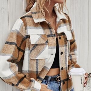 This beautiful plaid jacket has a fold-down collar with bottom cuffed sleeves and buttons down the front closure. This adorable jacket has two pockets on each side in front of the jacket. It is well made and is soft to the touch. The fabric is thick and composed of 65% cotton and 35% polyester. This is your grab-n-go jacket! Perfect colors for this fall.