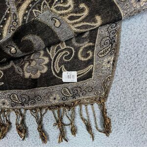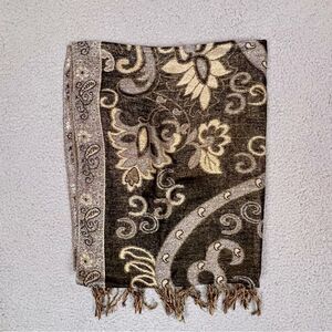 Pre-owned Women’s brown and gold glitter scarf unk material but not silk no holes or stains good condition. Approximately 27”x60”. Very soft material
