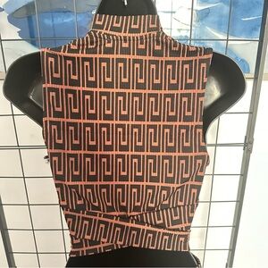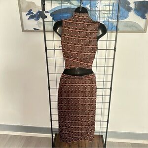 BROWN/BLACK PRINT DESIGN RIBBED MOCK NECK CUT OUT TOP & MIDI SKIRT SET. GREAT STRECTH. FITTED.
