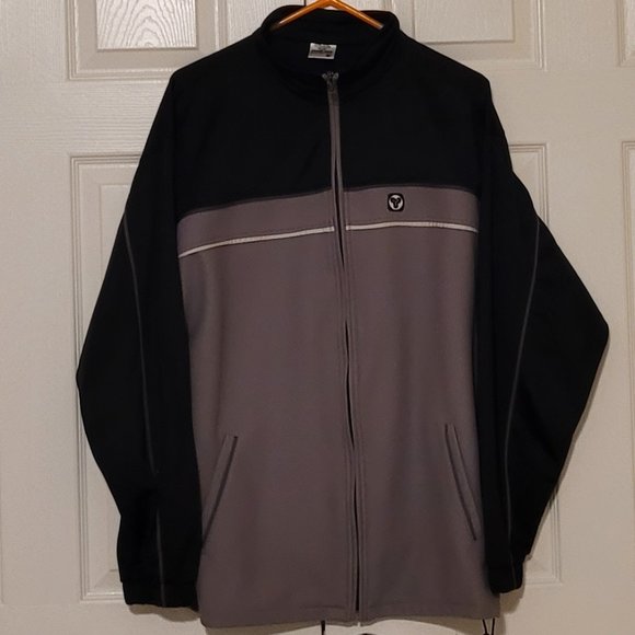 RARE BRUGI men's nicely detailed full zip jacket with adjustable cinch at bottom. Two open pockets. Thin, vertical white line at back bottom. 100% polyester. Made in Italy.