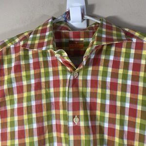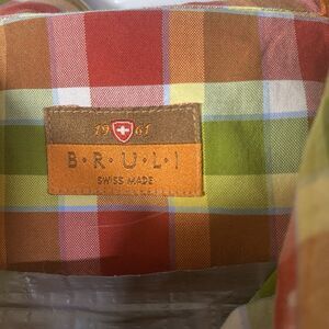 BRULI Shirt Mens Large Check Plaid Red Green Button Front Swiss Made