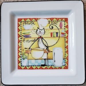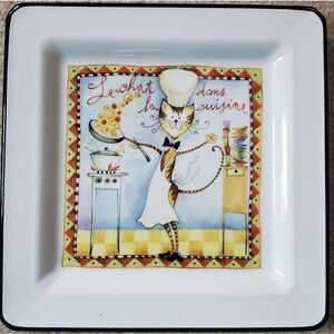 - Design Details: Designed by Brunelli, the themes are cats in the kitchen. These square ceramic plates have French writings: "Le chat dans la cuisine," "Le jolie menu," "Pasta à tout le monde, " and "Petit gâteau."
