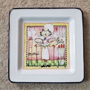 - Design Details: Designed by Brunelli, the themes are cats in the kitchen. These square ceramic plates have French writings: "Le chat dans la cuisine," "Le jolie menu," "Pasta à tout le monde, " and "Petit gâteau."