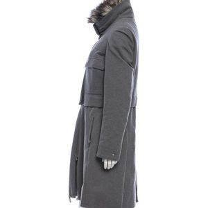 Grey Brunello Cucinelli fur-trimmed knee-length coat with four pockets and zip closure at front. Size not listed, estimated from measurements.