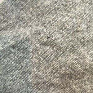 Good pre-owned condition. No stains, however, there are 5 small holes on the sleeve/cuff and one small hole on the front (which is barely noticeable)