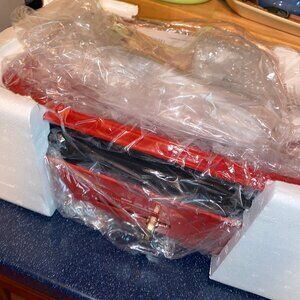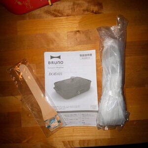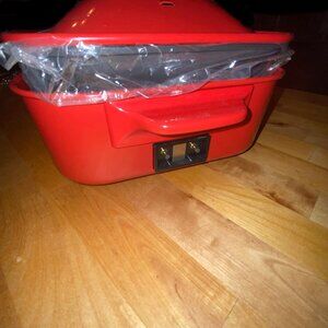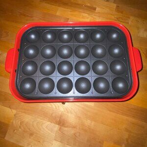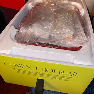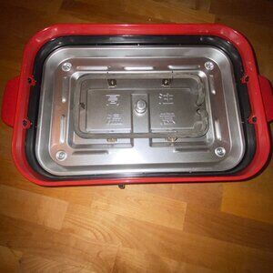 Pristine, never used Bruno hotplate grille griddle in a shiny red with a bright yellow Woodstock handle. Cute Beaglescouts design in gold on the front. Comes in the original box with the cord, instructions, spatula, 2 plates (one plain, one with wells) and a spare plain knob. Measures about 9 x 13 inches. This is a Japan-exclusive item but it does work fine on US voltage.