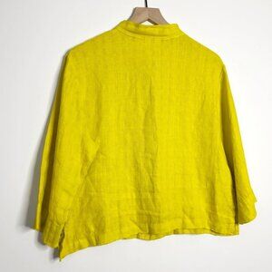 - Keywords: 3/4 sleeves, button front shirt, hidden placket, Mandarin collar, bright yellow, boxy, lagenlook