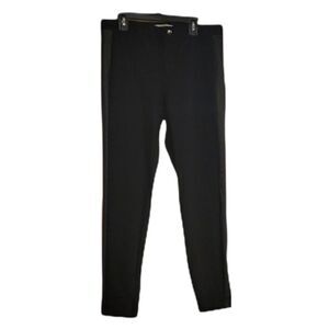 These are in excellent pre-owned/ like new condition worn only once for about 4 hrs. They are made like jeans (zipper) but fit like leggings. Black soft stretch material witha faux leather stripe down side of leg. See photo for close up of stripe. These pants add interest to any top or sweater and give it an edgy look.