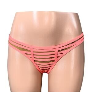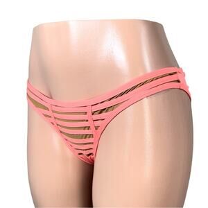 Beach Bunny Swimwear hard summer skimpy bikini bottom in coral with rows of binding and nude lining to give the illusion of skin. Skimpy coverage, side ties.