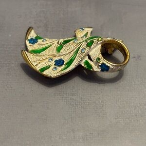 This exquisite brooch features a stunning floral design with vibrant green and blue accents. Perfect for adding a touch of elegance to any outfit.