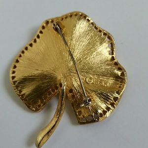 Great condition vintage gold tone brooch with open edging. Signed BSK. In the shape of a lilly pad.