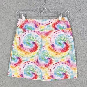 Pre-owned B-Skinz Women’s lined Golf skorts Size XS white with multicolored pattern. Almost like a psychedelic style. Elastic still good. Crotch area is good. No stains or holes. Pockets. Cleaned. Good condition