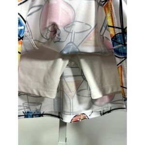 Pull on. Elasticized waistband. Two front pockets. One back pocket. Built-in compression shorts. White with shades of pink, blue, yellow, and orange cocktails throughout. Stretch material. Quick dry. Moisture wicking. Sporty. Fun. Colorful. Vibrant. Golf. Tennis. Pickleball. Resort. Country club. Happy hour. Snowbird. Vacation. Cruise. Activewear. Athleisure. D