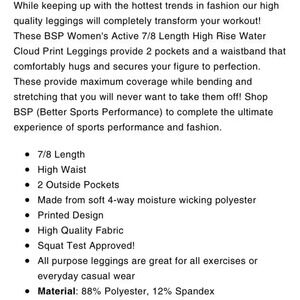 BSP active 7/8 length high rise water cloud design, high waist leggings with 2 pockets, pocket inserts on both sides, purple tie dye color design, wide waistband for control, no size tags, but after taking measurements, determined it to be a XS, stretchy enough to fit as a Small, preowned but excellent condition, no holes, stains, snags, tears. •Smoke free, Pet free home, top rated seller, super fast shipper• ✨Bundle 2 or more items to GET AN EXTRA * 20% * OFF aaand SAVE ON SHIPPING!✨
