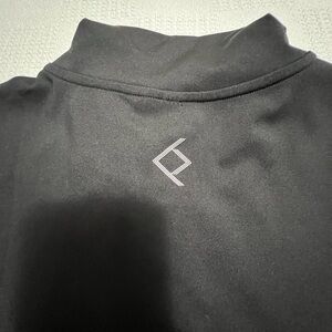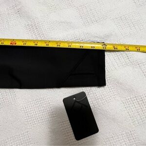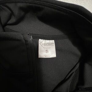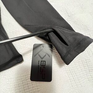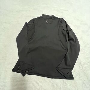 Has pocket and zipper. Plus holes on the thumb. Stretch material