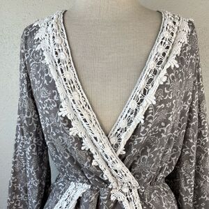 Super cute boho style romper featuring a chenille style trim and flared sleeves. It measures 18 inches armpit to armpit laying flat, 13 inches at the waist, and 25 inches in length from shoulder to hem.