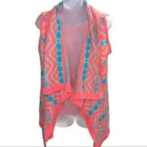 B-Sharp geometric print asymmetrical open cardigan - sleeveless - bright orange, teal & tan - size S - EUC