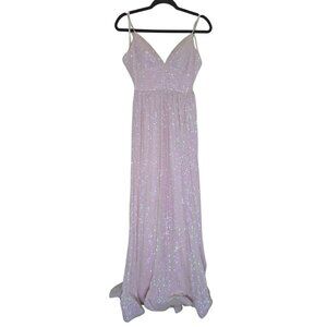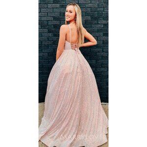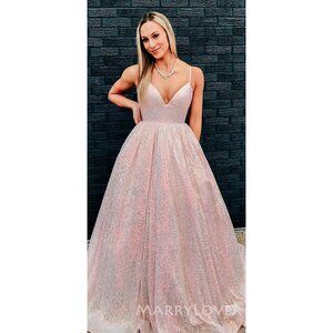 This exquisite light pink gown is designed with shimmering sequins, creating a glamorous and elegant look. The deep V-neck and spaghetti straps offer a refined silhouette, ideal for formal occasions. The iridescent finish adds a touch of sparkle, making it a sophisticated choice for evening wear.