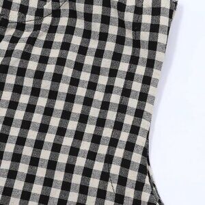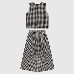 Classic black and white checkered, vest button design, paired with pleated skirt, retro and playful.