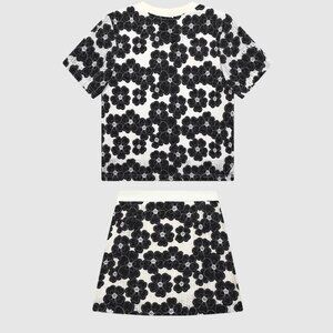 The black and white floral pattern is eye-catching, and the short-sleeved and short skirt combination is playful and cute.