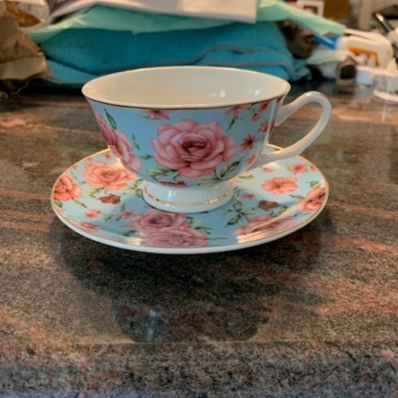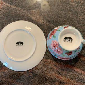 Beautiful sky blue with large pink roses, small red roses and green leaves. Made by BTAT --Brew to a Tea. Measures approx. Cup 3"T x 4" diameter (not including handle) , 6" saucer. Excellent condition. White spots/lines are glare from lights. *Color may vary slightly from pictures. *It should be remembered: old dishes with golden can not be washed in the dishwasher. Only hand wash!