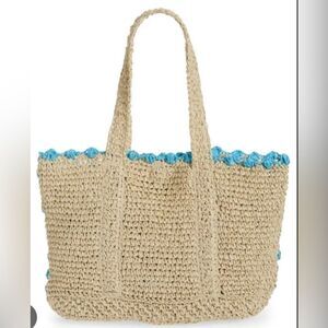 BTB Los Angeles LISBETH POMPOM STRAW TOTE IN AQUA OS NWT 148.00