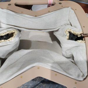Exterior color-blocked design in black, grey, and natural beige straw