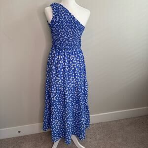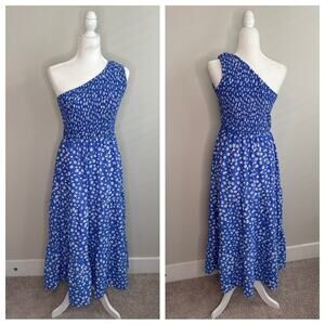 Features a one shoulder construct, super flattering ruching at bodice, tiered midi/maxi length skirt and partially lined. Polyester/spandex blend. Worn once to dinner. Excellent preowned condition: like new with no signs of wear.