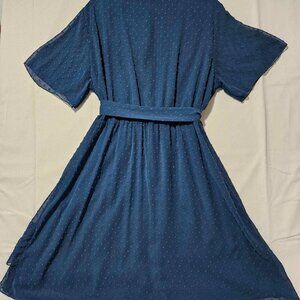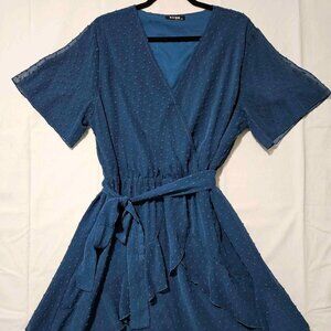 Chic and feminine blue wrap dress with textured polka-dot detail. Features a flattering V-neckline, short sleeves, and a self-tie waist belt for a custom fit. The ruffled hemline adds a playful touch, while the lightweight fabric makes it perfect for warm weather. Ideal for casual outings, brunch, vacations, or even dressed up with heels for an evening look. A versatile piece that can be styled for both day and night.